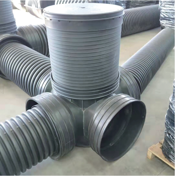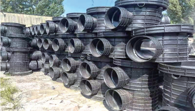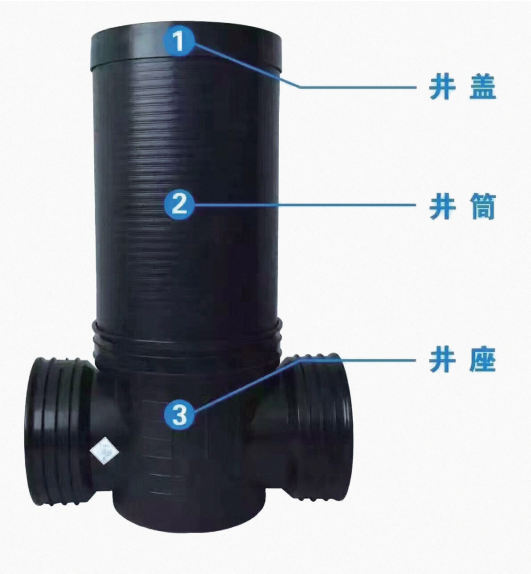 塑料檢查井由井座、井筒、井蓋和塑料檢查井零配件組成。檢查井井筒可采用埋地排水管材,如 HDPE 雙壁波紋管、HDPE 中空纏繞管等。