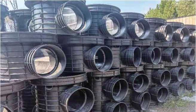 塑料檢查井由井座、井筒、井蓋和塑料檢查井零配件組成。檢查井井筒可采用埋地排水管材,如 HDPE 雙壁波紋管、HDPE 中空纏繞管等。