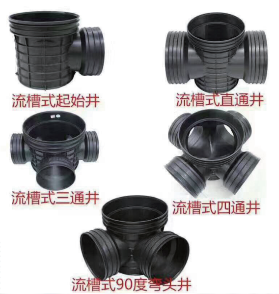 根據接管數和角度不同有起始井座、直通井座、三通井座、四通井座、90 度彎頭井座等。為了適應各種排水狀況,塑料檢查井同時配套有內外徑轉換接頭、馬鞍接頭、變徑接頭、彙合接頭、變角接頭等與之配套的塑料檢查井零配件。這些零配件和井座共同用來保障整個排水係統的流通性和密封性。